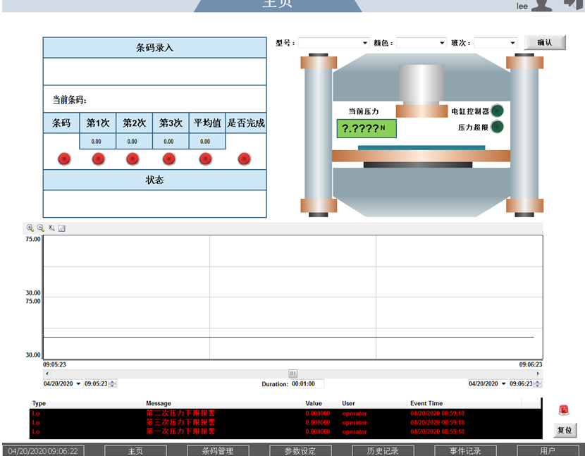 軟件工作流程 登陸系統(tǒng):以管理員或者工程師權限登陸系統(tǒng)。 配置參數:設置最小壓力檢測值,壓力測試等待時間,第一步等待時長,條碼序列號長度,壓力超限值等等。 配置條形碼的組成元素:條形由車型,顏色,班次和日期等因素組成,管理員需要配置這些信息。 掃碼執(zhí)行壓力檢測:用戶需要在首頁掃描框中,掃入條碼,系統(tǒng)自動執(zhí)行平整度檢測。飼服電缸頂端3次按壓檢測部位,測試每次壓力值。 查詢檢測結果:檢測完成后,用戶可以直接在首頁查看檢測結果。 打印報表:用戶可以查詢指定日期范圍內的檢測數據,導出PDF報表。