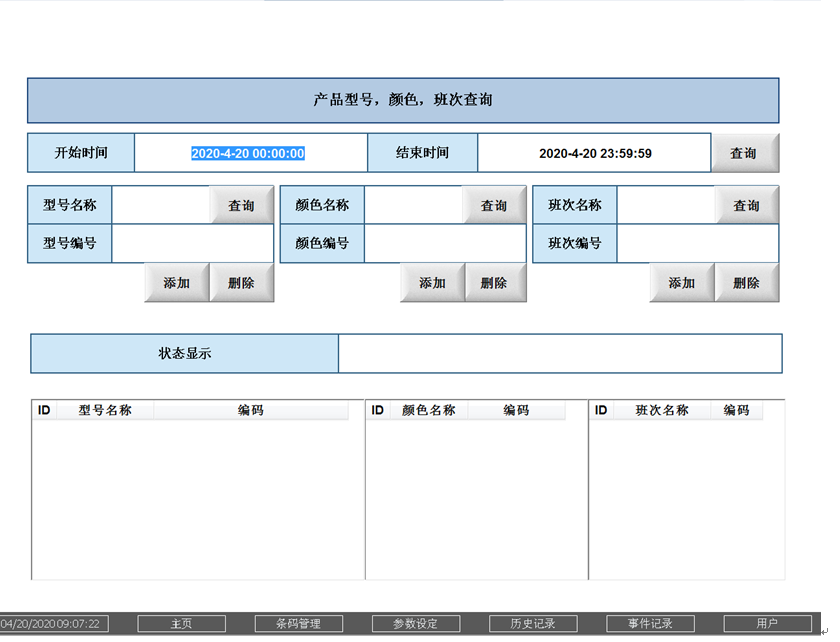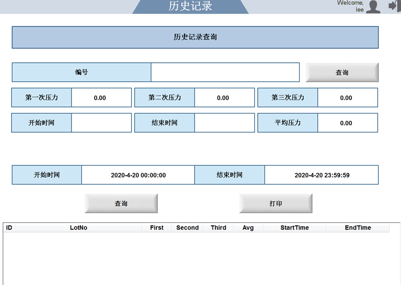 歷史記錄 利用條碼或者時間查詢壓力測試數據。 可以查詢該條碼的車頂棚是否檢測過。 輸入開始時間,結束時間,點擊下方的“查詢”按鈕,如果有記錄,則占擊“打印” 按鈕,可以打印PDF文檔。 事件記錄 顯示人員的操作記錄